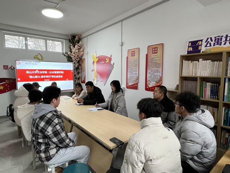 为深入落实立德树人根本任务,畅通新学期师生沟通渠道,推动育人资源下沉,切实倾听学子诉求、解决成长困惑,2026年3月5日,文法学院(公共管理学院)“凝心聚力 携手同行”师生座谈会在“寓见宏远”一站式学生社区举行。学院党委书记杨健民、党委副书记张玉华出席会议,12名来自不同年级和专业的学生代表积极参与。
