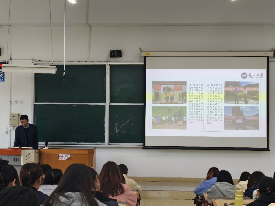 杨健民首先以“河北银里村第一书记”的宣传视频引入“乡村振兴”这一议题,让同学们了解乡村振兴战略是在怎样的背景下提出并施行。杨健民从自身实际经验出发向同学们讲述驻村工作时集中力量打造美丽宜居乡村的种种措施与成效,并引导学生思考如何利用专业所学为乡村振兴做贡献。最后,杨健民对在场同学提出四点希冀:一是立足中国大地,厚植爱党爱国爱社会主义的情感;二是树牢为民情怀,主动发挥自身能力贡献绵薄之力;三是坚持自我革命,增强忧患意识敢于斗争敢于胜利;四是赓续使命担当,以舍我其谁的勇气魄力接续奋斗。