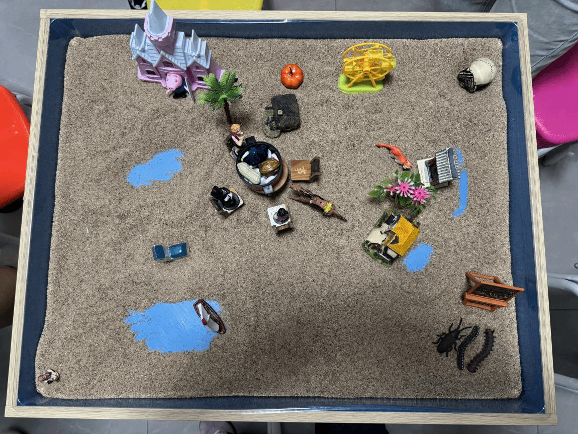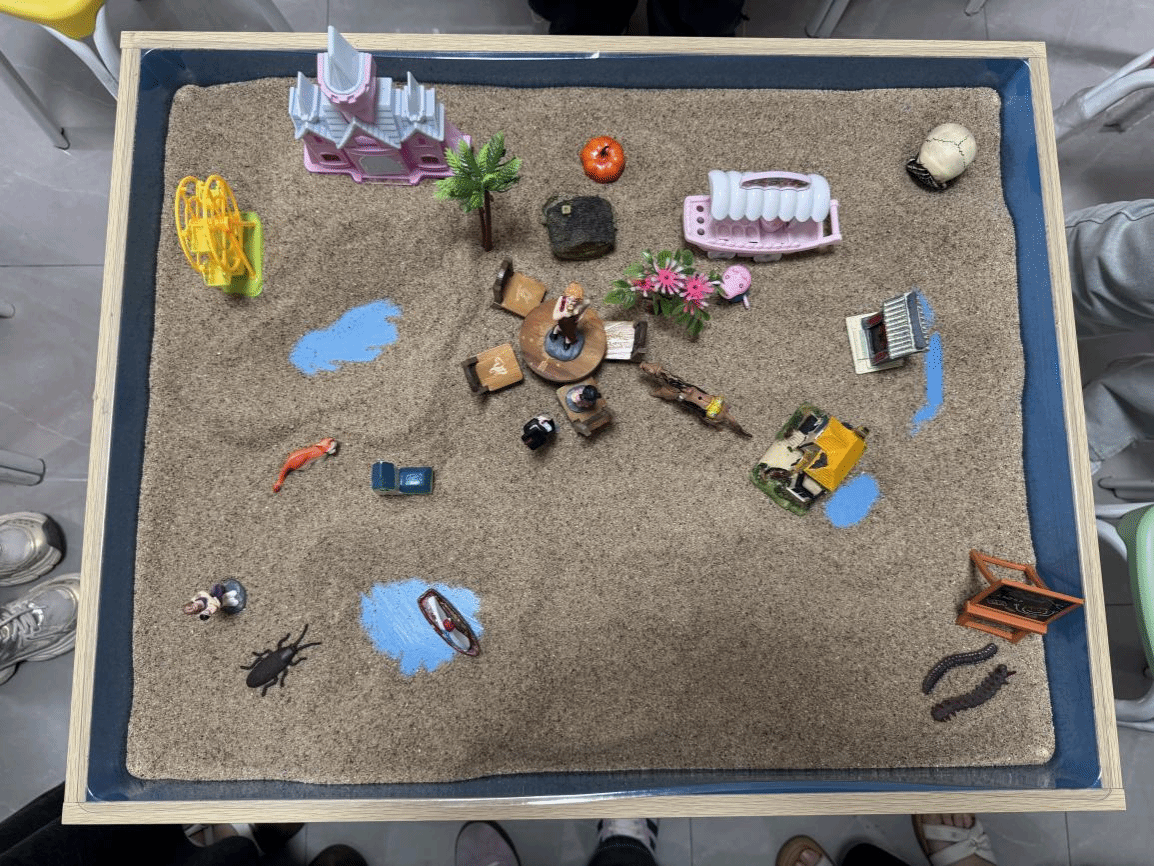 活动伊始,卢雨涵以“感受沙子”为切入点,引导同学们通过触摸沙粒、摆放沙具,逐步放松身心、打开心扉。六名来自同一宿舍的同学在沙盘中共同构建场景,通过非语言的方式表达内心感受,潜移默化中增进了彼此的理解与信任。