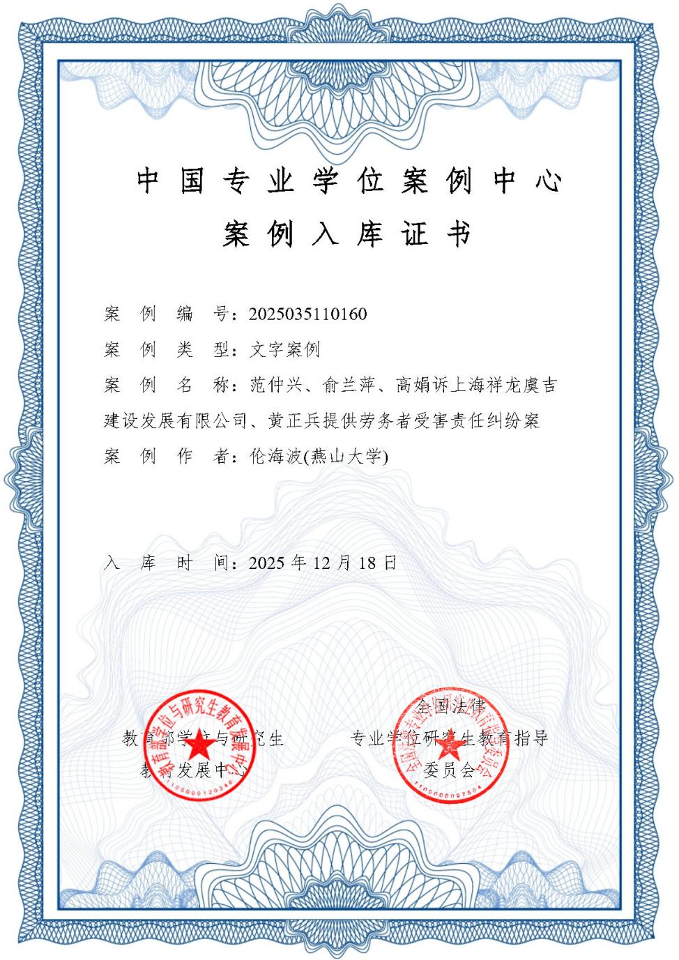 近日,全国法律专业学位研究生教育指导委员会公布第五批法律硕士专业学位教学案例评审结果。我院伦海波副教授编写的《范仲兴、俞兰萍、高娟诉上海祥龙虞吉建设发展有限公司、黄正兵提供劳务者受害责任纠纷案》成功入选,并被收录至“中国专业学位案例中心案例库”。