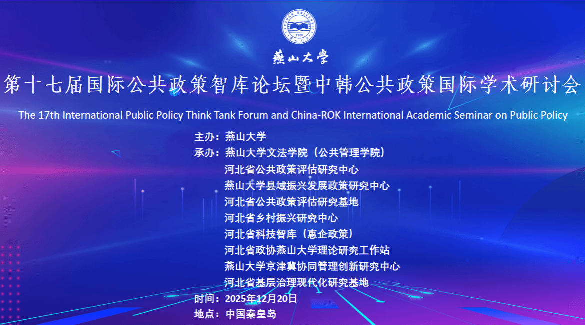 12月20日,第十七届国际公共政策智库论坛暨中韩公共政策国际学术研讨会在燕山大学成功举办。会议由燕山大学主办,文法学院(公共管理学院)、河北省公共政策评估研究中心、燕山大学县域振兴发展政策研究中心等联合承办。