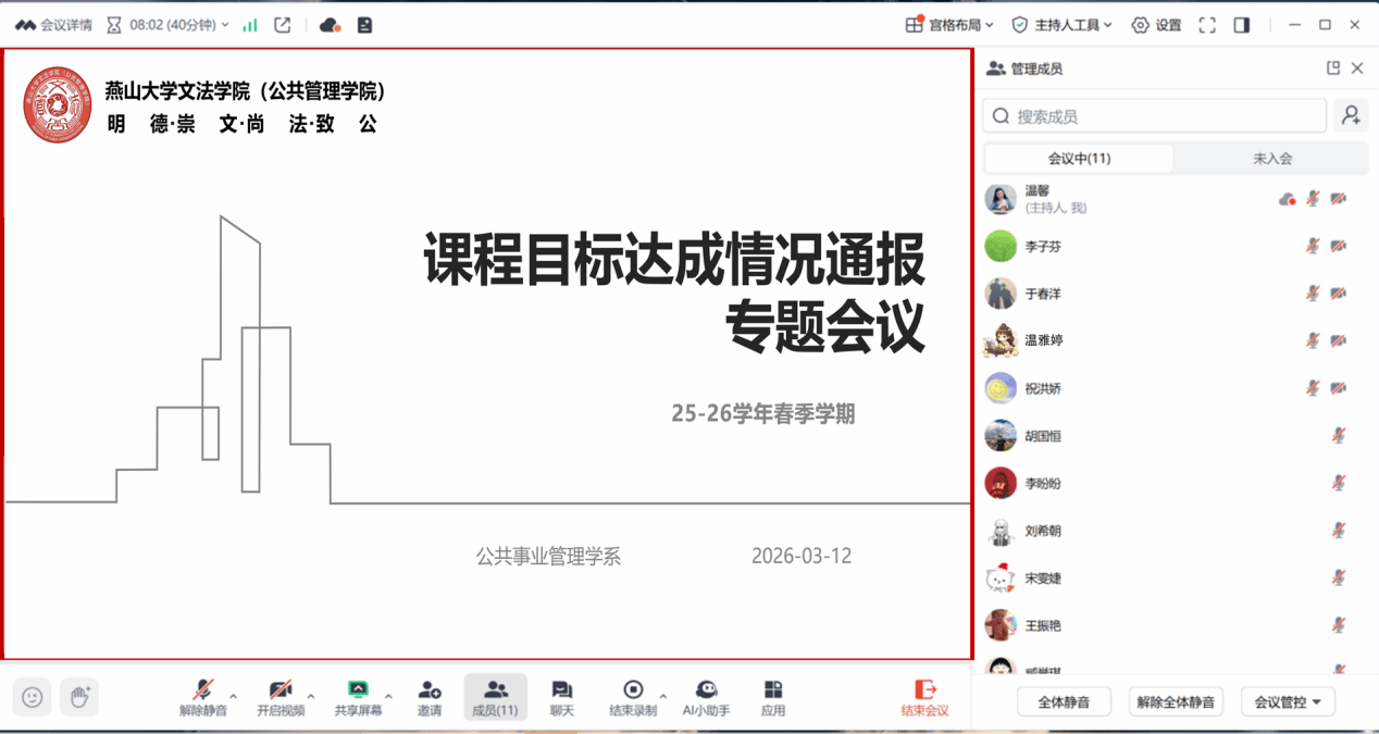 为持续推进教学质量改进,落实课程质量闭环管理要求,公共事业管理学系于2026年3月12日组织召开2025-2026学年秋季学期课程目标达成情况通报专题会议。会议由系副主任温馨主持,全体教师参加。